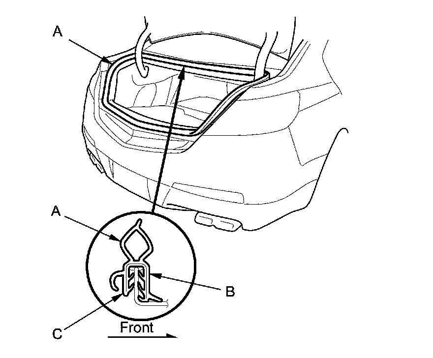 1. Remove the trunk lid weatherstrip (A) by pulling it off.