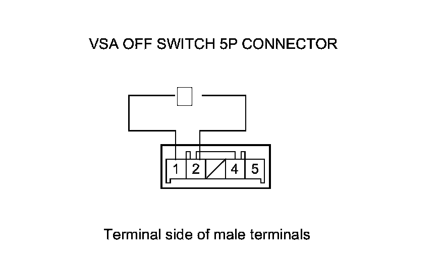 5. On the switch side, check for continuity between the VSA OFF switch 5P connector terminals No. 1 and No. 2. There should be no continuity when the button is pressed, and continuity when the button is released.