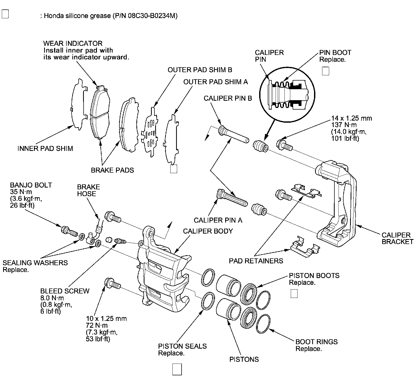 Remove, disassemble, inspect, reassemble, and install the caliper, and note these items: