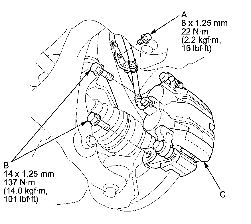 4. Remove the brake caliper bracket mounting bolts (B), then remove the caliper assembly (C) from the knuckle. To prevent damage to the caliper assembly or brake hose, use a short piece of wire to hang the caliper assembly from the undercarriage. Do not twist the brake hose excessively.