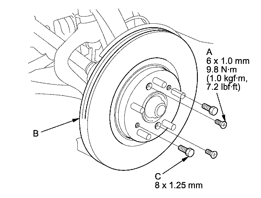 NOTE: If the brake disc is stuck to the front hub, thread two 8 x 1.25 mm bolts (C) into the brake disc to push it away from the front hub. Turn each bolt 90 degrees at a time to prevent the brake disc from binding.