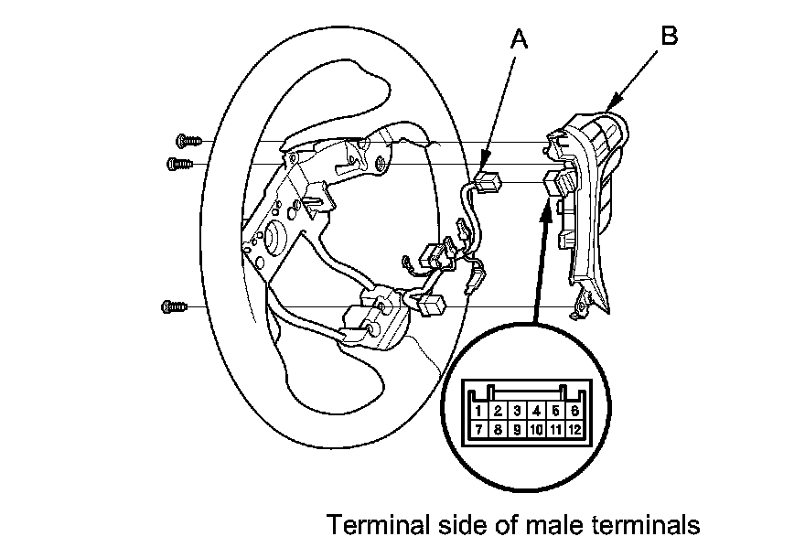 3. Disconnect the cable real subharness connector (A), then remove the steering wheel trim/cruise control combination switch (B).