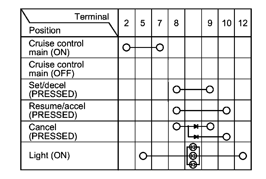 - If there is continuity, and it matches the table, but the cruise control combination switch failure occurred on the cruise control input test, check and repair the wire harness on the switch circuit.