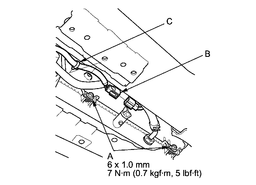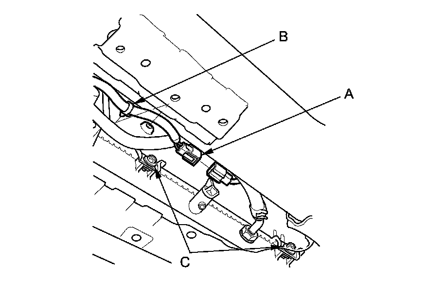 8. Connect the A/C condenser fan motor connector (B), and install the harness clamp (C).