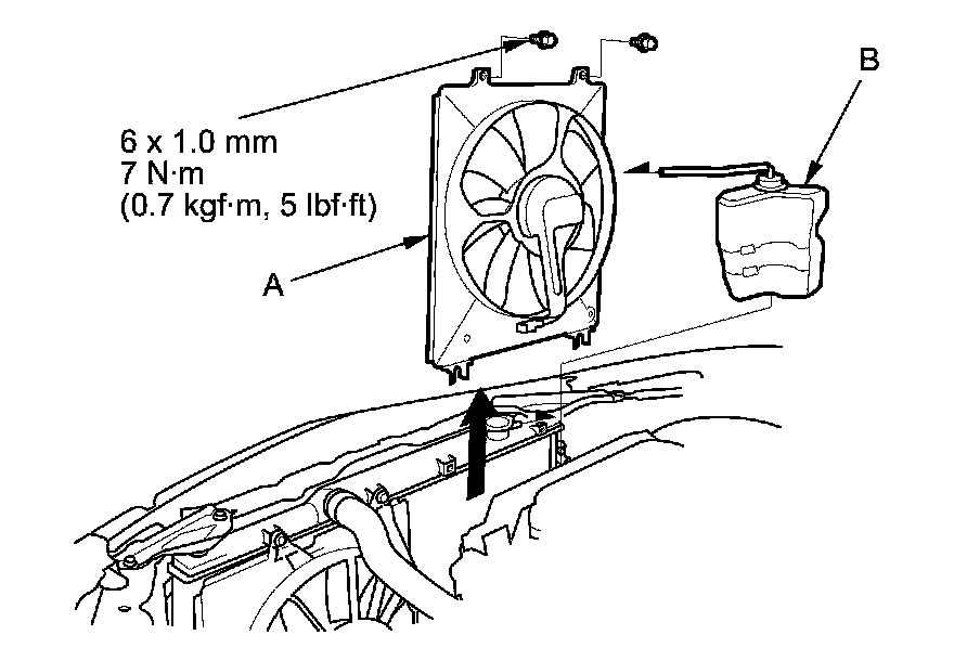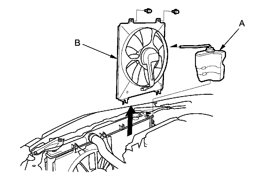 4. Install the A/C condenser fan shroud assembly (A), then install the coolant reservoir (B).