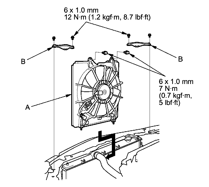 9. Disconnect the radiator fan motor connector (A), and remove the harness clamps (B).