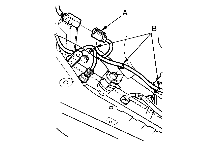 6. Connector the radiator fan motor connector (A), and install the harness clamps (B).