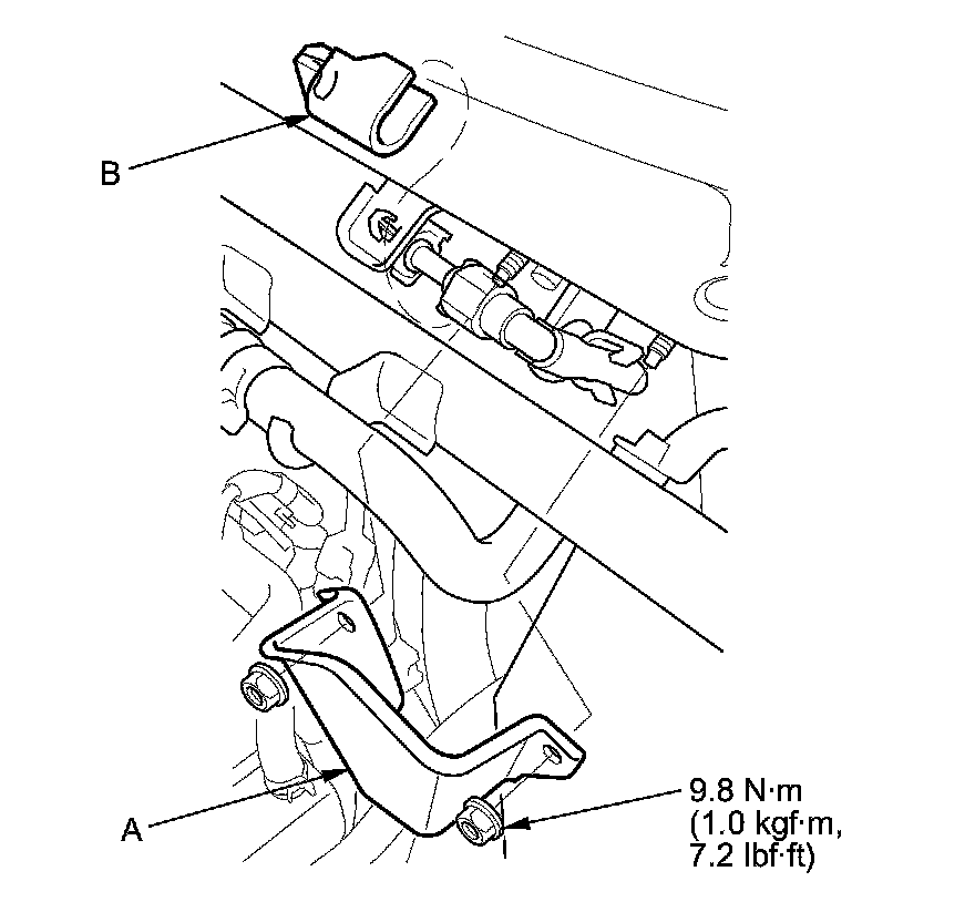 7. Remove the cover (A) and the quick-connect fitting cover (B); without SH-AWD system Fuel Line/Quick-Connect Fitting Removal, with SH-AWD system Fuel Line/Quick-Connect Fitting Removal.