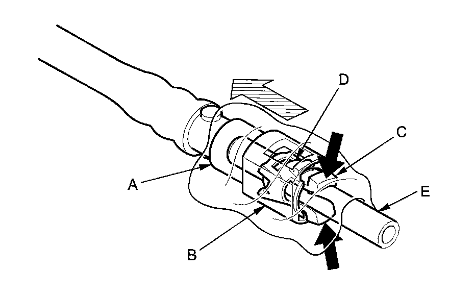 13. Disconnect the quick-connect fitting (A): Hold the connector (B) with one hand, and squeeze the retainer tabs (C) with the other hand to release them from the locking tabs (D). Pull the connector off.
