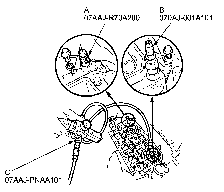 9. Remove the sealing bolts, then install the VTEC air stop tool A (A) and the VCM air adapter (B) to the inspection hole, then connect the air pressure regulator (C) as shown.
