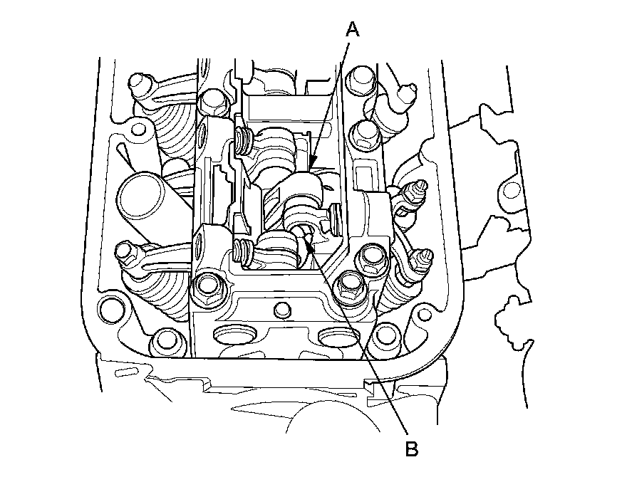 11. With the specified air pressure applied, rotate the crankshaft pulley clockwise, and visually check all the intake primary rocker arms (A) and the intake secondary rocker arms (B) move together.