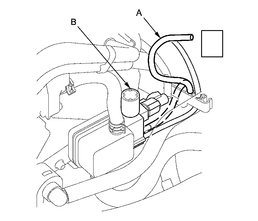 14. Disconnect the vacuum hose (A) from the engine mount control solenoid valve (B), and connect a vacuum pump/gauge, 0-30 in.Hg, to the vacuum hose. Apply about 20 in Hg of vacuum, and wait for 20 seconds.