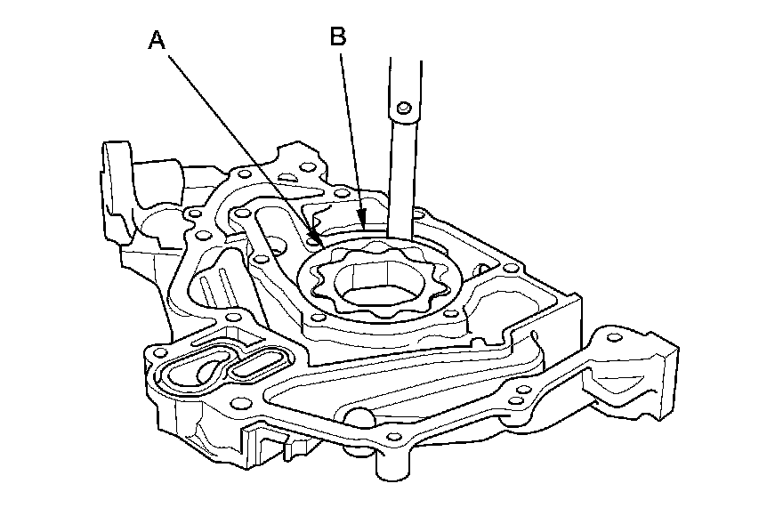 4. Check the pump housing-to-outer rotor radial clearance between the outer rotor (A) and the pump housing (B). If the pump housing-to-outer rotor radial clearance exceeds the service limit, replace the oil pump assembly.