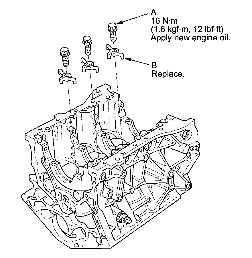 2. Remove the oil jet bolt (A), then remove the oil jet (B).