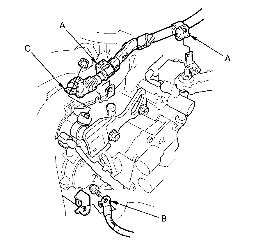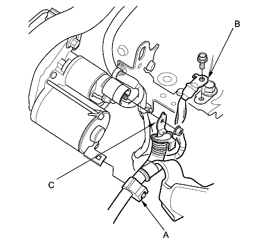 10. Remove the harness clamps (A) and the ground cable (B), then disconnect the positive starter cable (C).