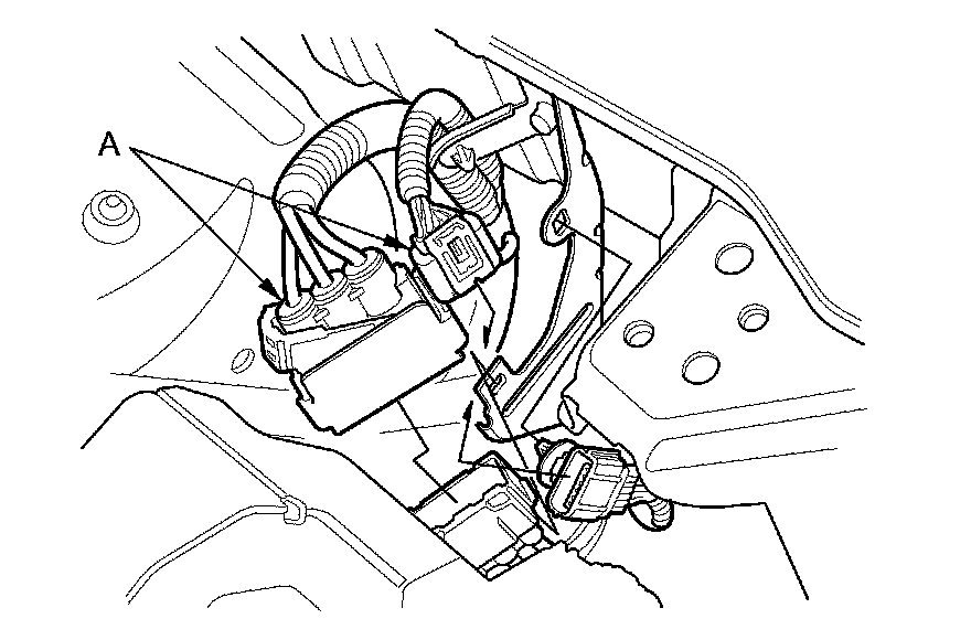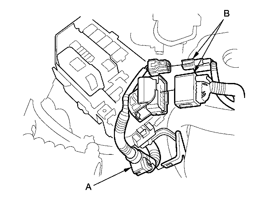 14. Remove the harness clamp (A), then disconnect the harness connectors (B).