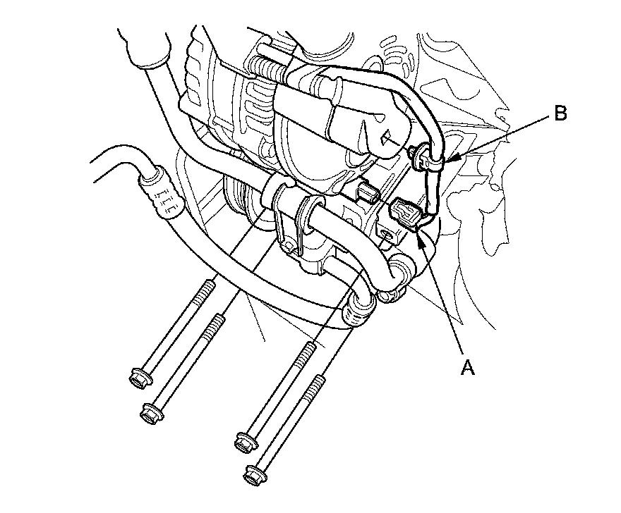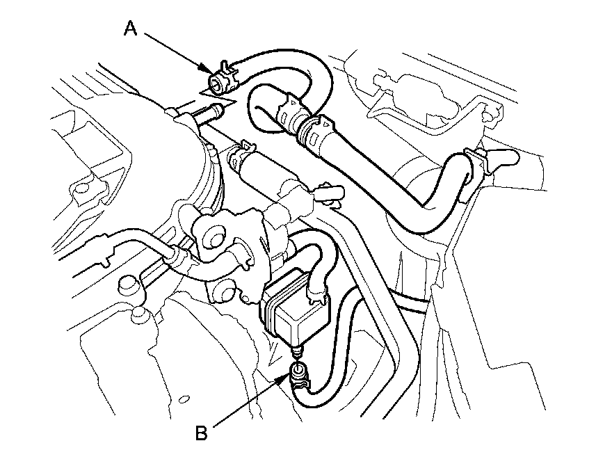 17. Disconnect the brake booster vacuum hose (A) and the evaporative emission (EVAP) canister hose (B).