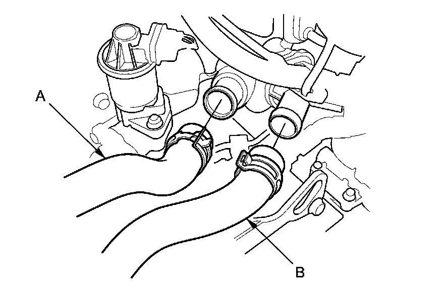 43. Disconnect the upper radiator hose (A) and the lower radiator hose (B).