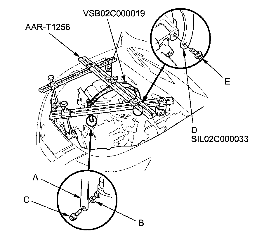 51. Lift and support the engine with the engine support hanger (AAR-T1256) and the engine hanger balance bar (VSB02C000019). Attach the front arm (A) to the front cylinder head with a spacer (B) and a 10 x 1.25 mm bolt (C). Remove the rear arm from the engine hanger balance bar, and install the 2008 V6 attachment arm (SIL02C000033), then attach the 2008 V6 attachment arm (D) to the rear cylinder head with a 8 x 1.25 mm bolt (E).