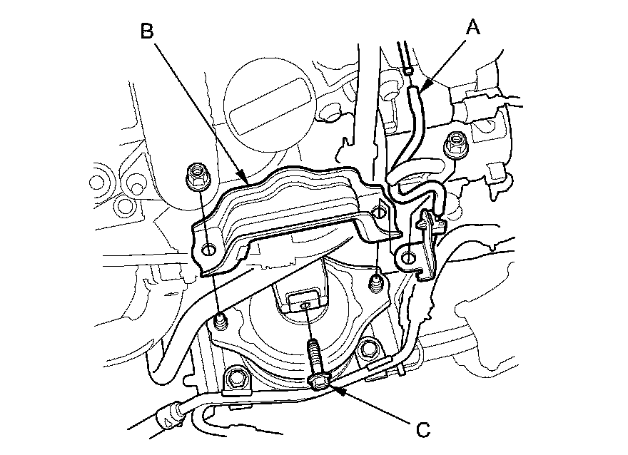 53. A/T model: Disconnect the vacuum hose (A) and remove the front engine mount stop (B), then remove the front engine mount bolt (C).