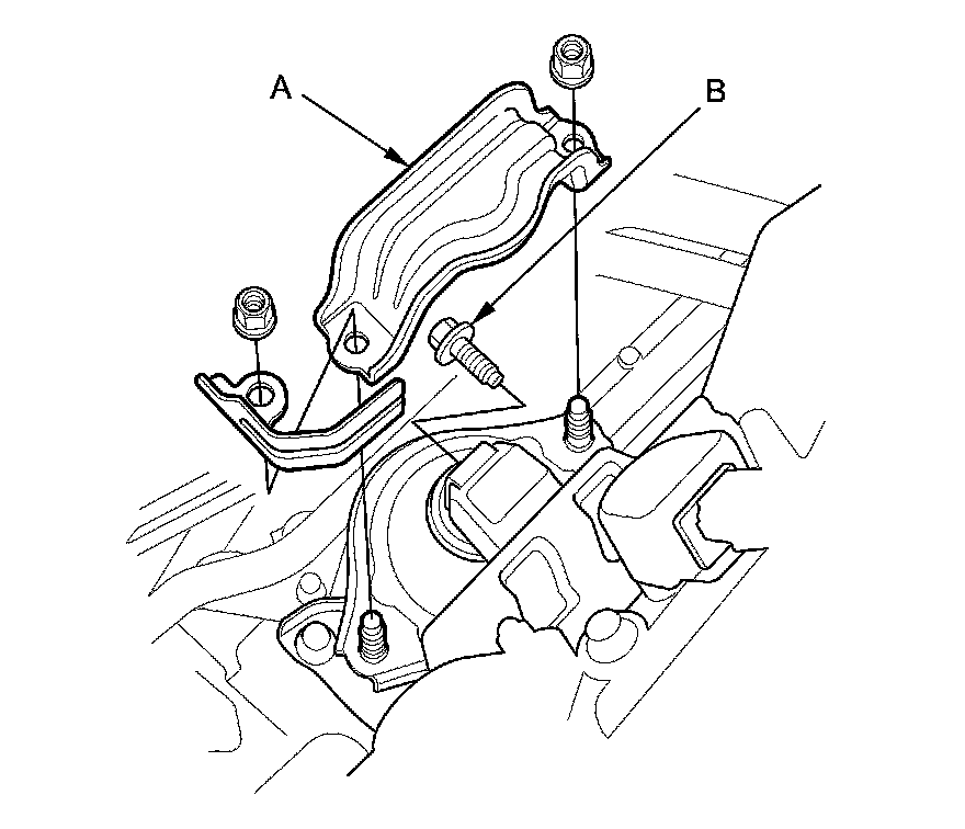 55. A/T model: Remove the rear engine mount stop (A), then remove the rear engine mount bolt (B).