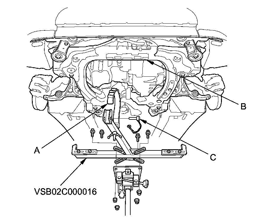 59. Attach the front subframe adapter (VSB02C000016) to the subframe by looping the belt (A) over the front of the subframe (B), then secure the belt with its stop (C).