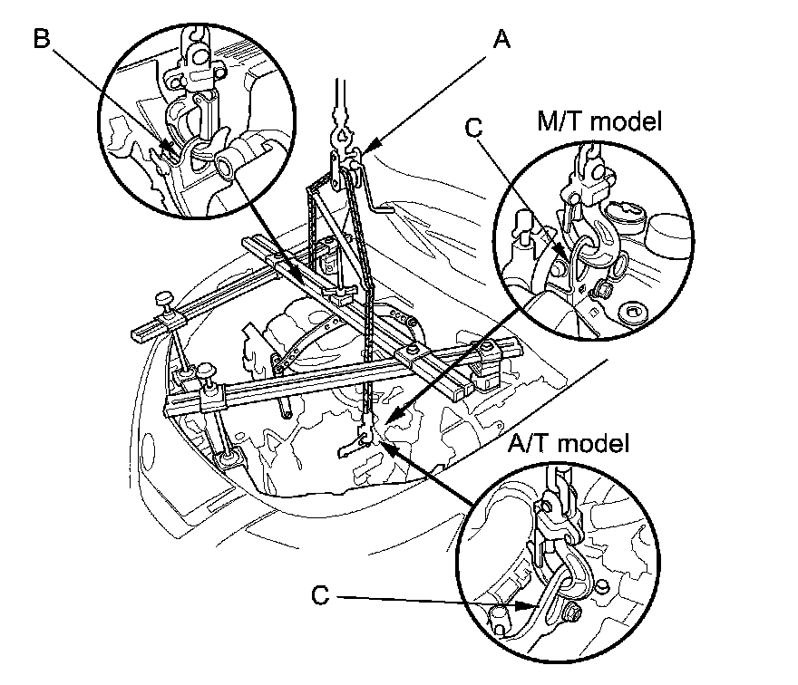 63. Attach a chain hoist (A) to the engine hook (B) and the transmission hook (C), then lift the engine/transmission until it is securely supported by the chain hoist and remove the engine support hanger and the engine hanger balance bar.