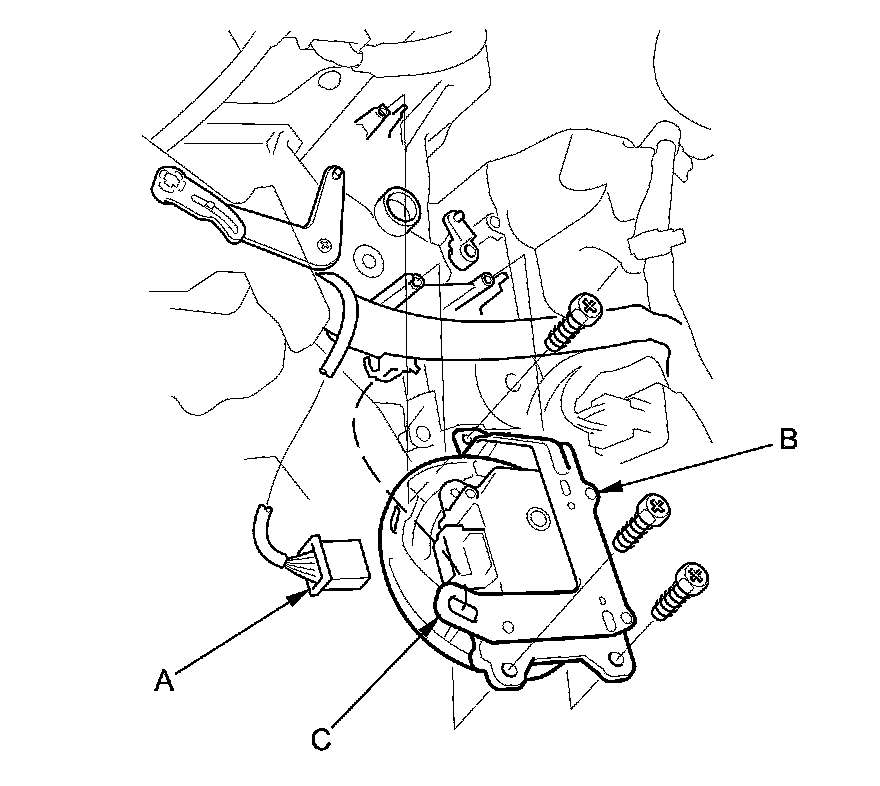 1. Release the lock (A), then remove the motor lever (B) from the mode control motor (C).