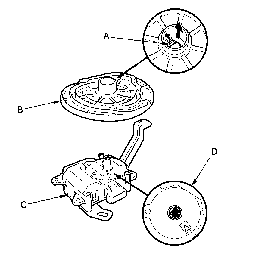 NOTE: Before installing the mode control motor, plug in the 7P connector, and set the passenger's side climate control mode to VENT. Check that the motor output shaft is lined up as indicated (D).