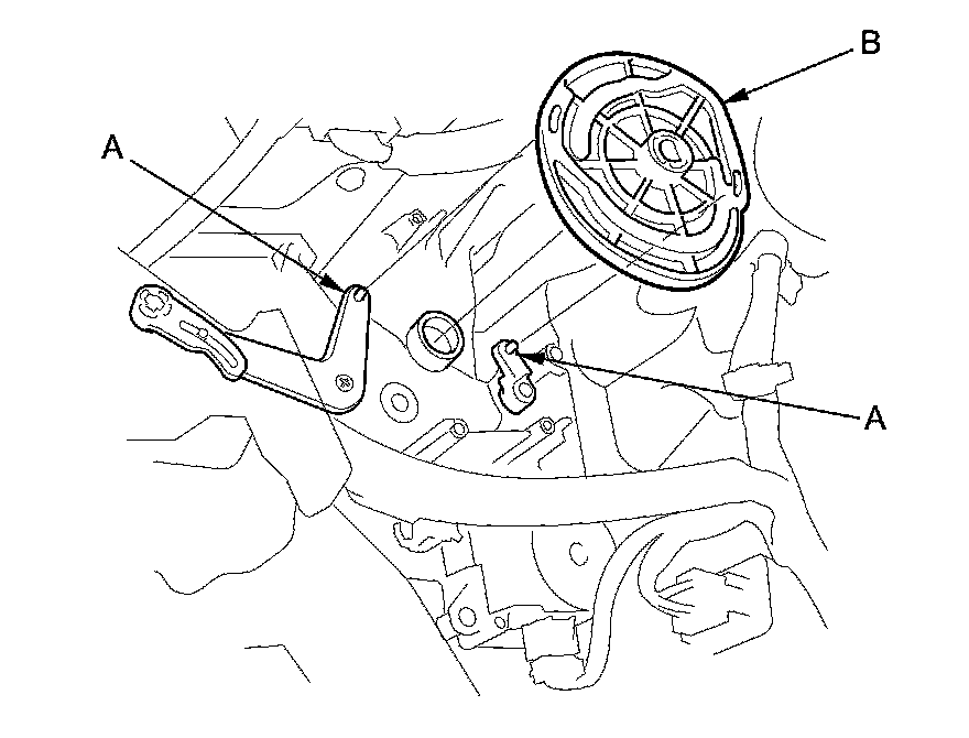 4. Release the wire from its harness clip (A), then remove the self-tapping screws and the passenger's heater duct (B).