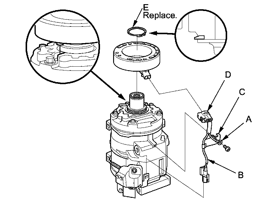 - Install the field coil with the wire side facing down, and align the boss on the field coil with the hole in the A/C compressor.