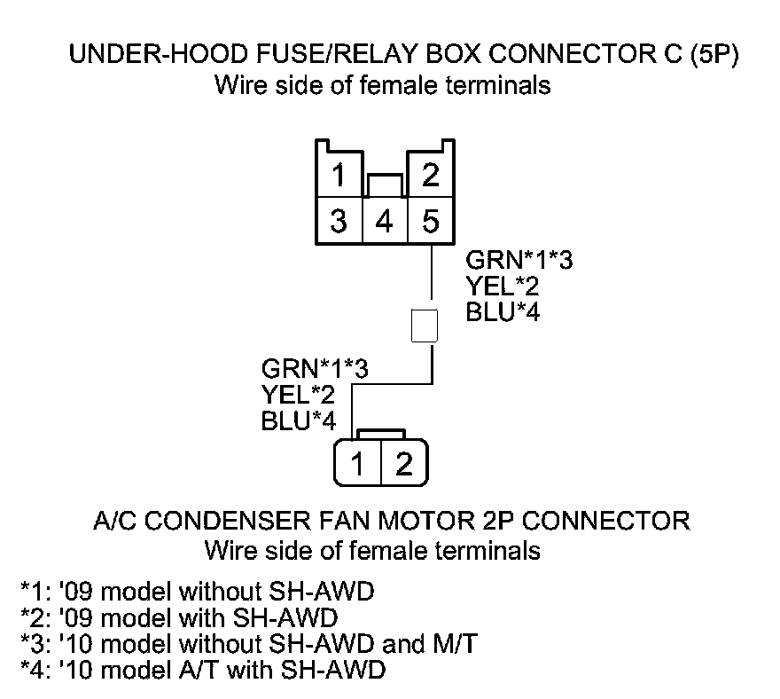 31. Check for continuity between under-hood fuse/relay box connector C (5P) terminal No. 5 and A/C condenser fan motor 2P connector terminal No. 1.