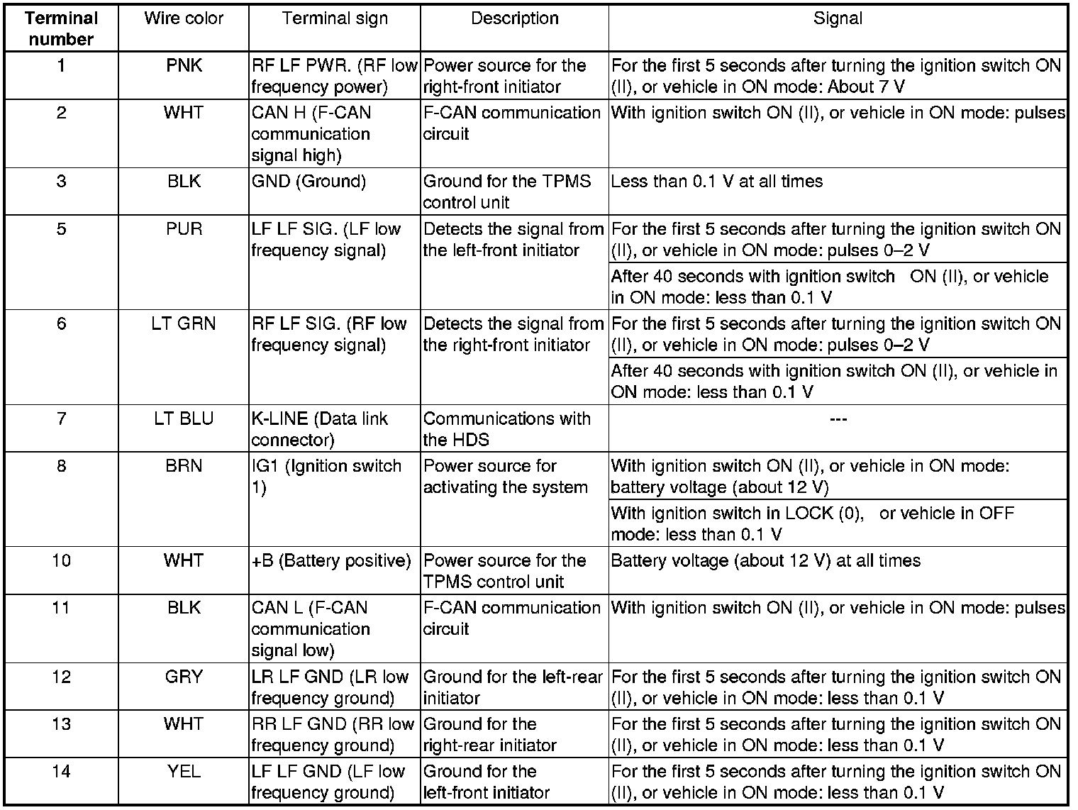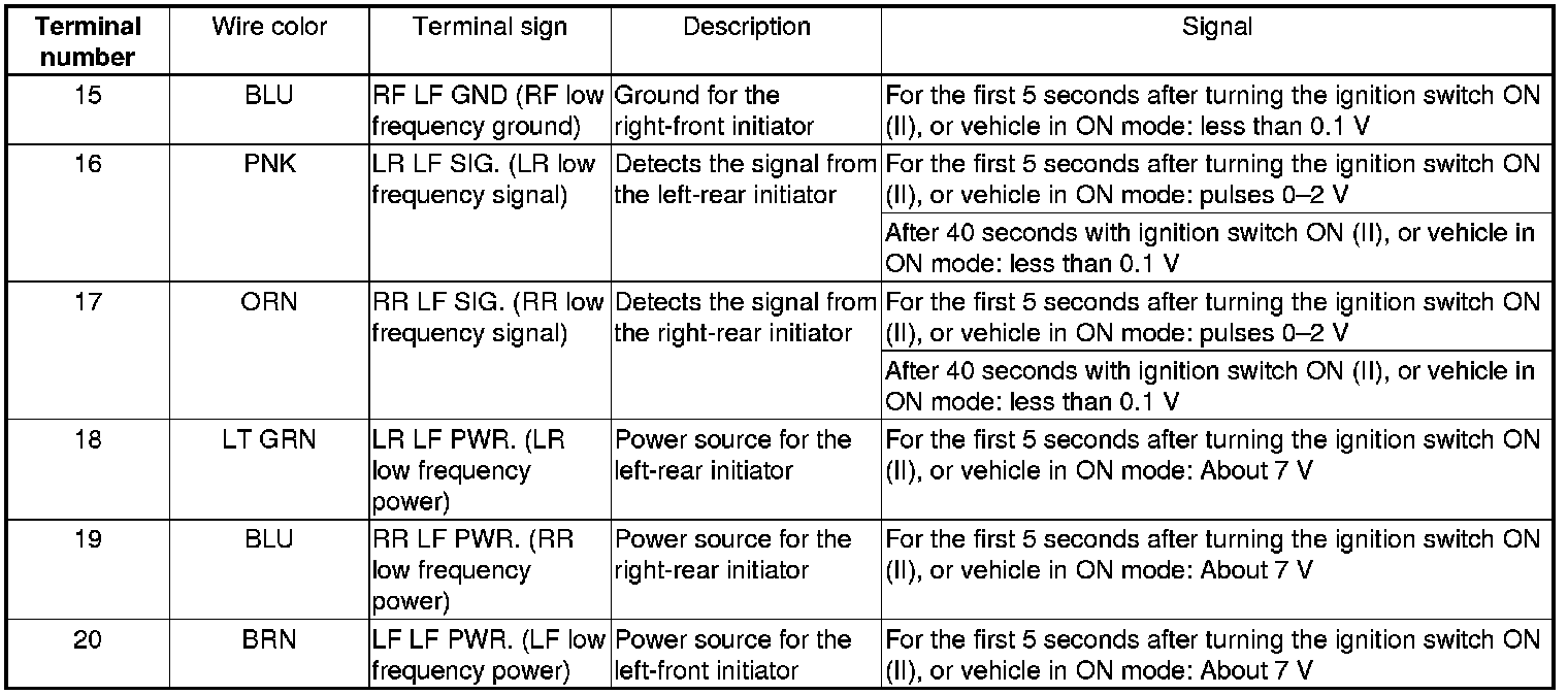 TPMS Control Unit Inputs and Outputs for 20P Connector (cont'd)