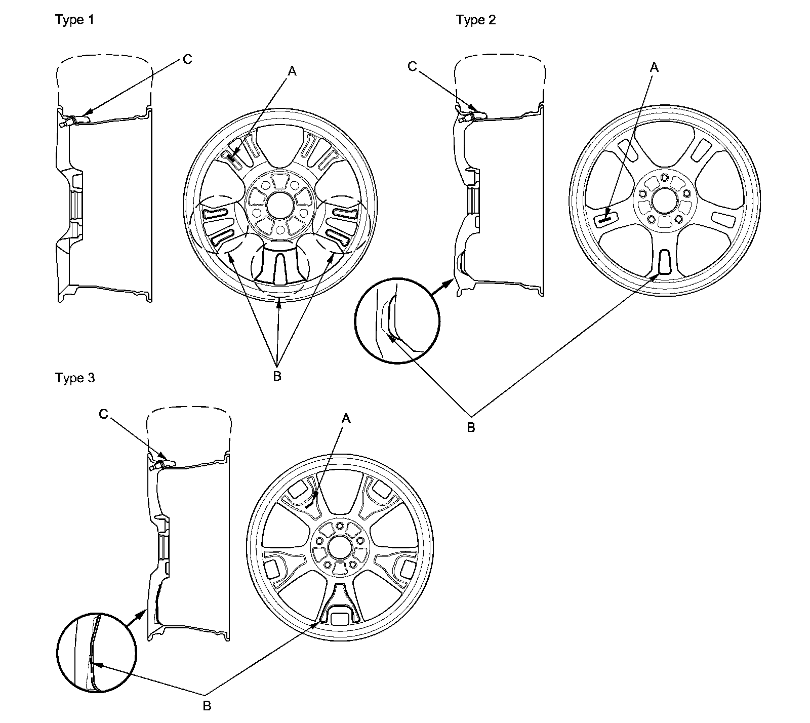 The TPMS will not work unless TPMS type wheels are installed on the vehicle. There are three different types of wheels used. The original equipment wheels have a "TPMS" mark (A) on them, and are counterweighted (B) by adding material on the opposite side of the tire pressure sensor (C), to counterbalance the weight of the sensor.