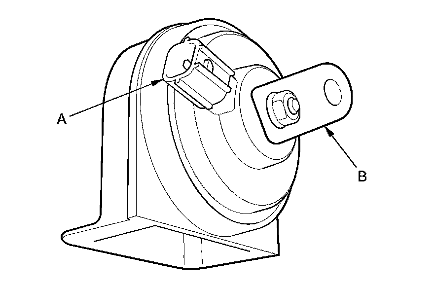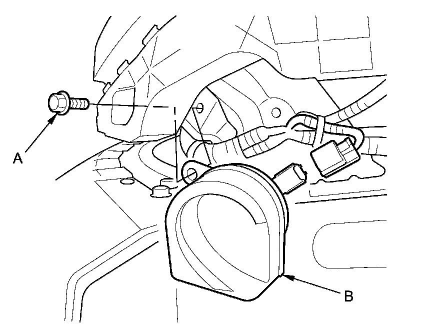 3. Test the horn by momentarily connecting battery power to the terminal (A) and grounding the bracket (B). The horn should sound.