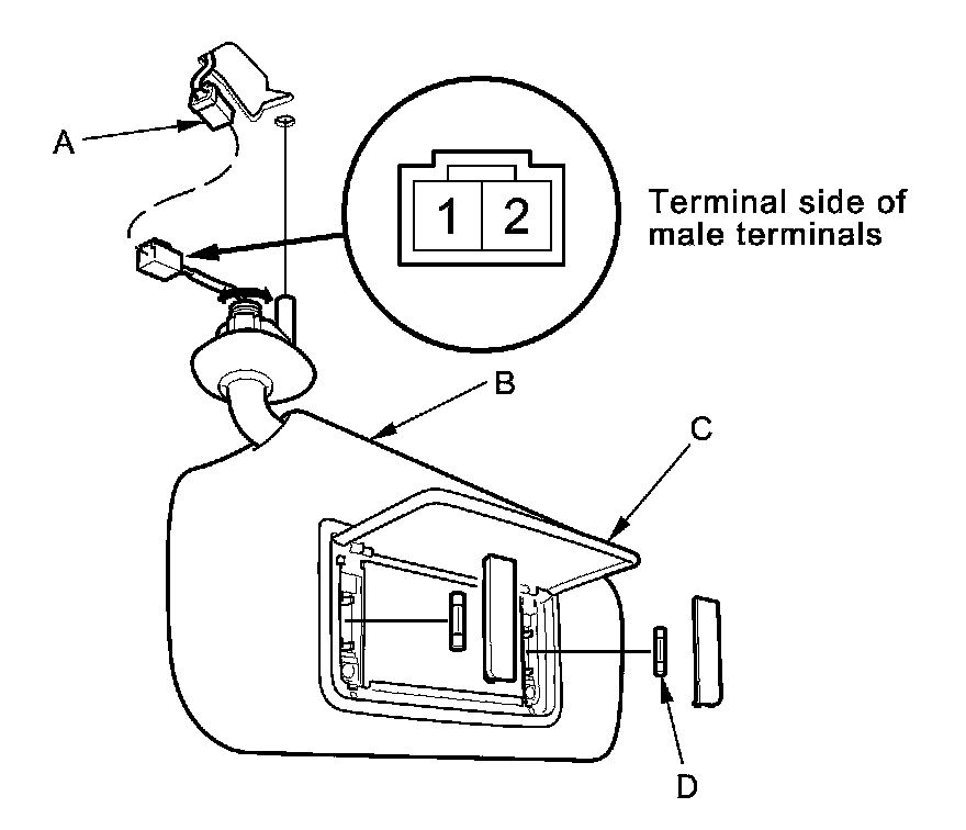 4. If the continuity is not as specified, check the bulbs (D). If the bulbs are OK, replace the sunvisor Service and Repair.