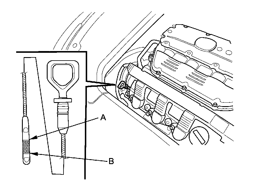 3. Remove the dipstick, and check the engine oil level. It should be between the upper mark (A) and the lower mark (B).