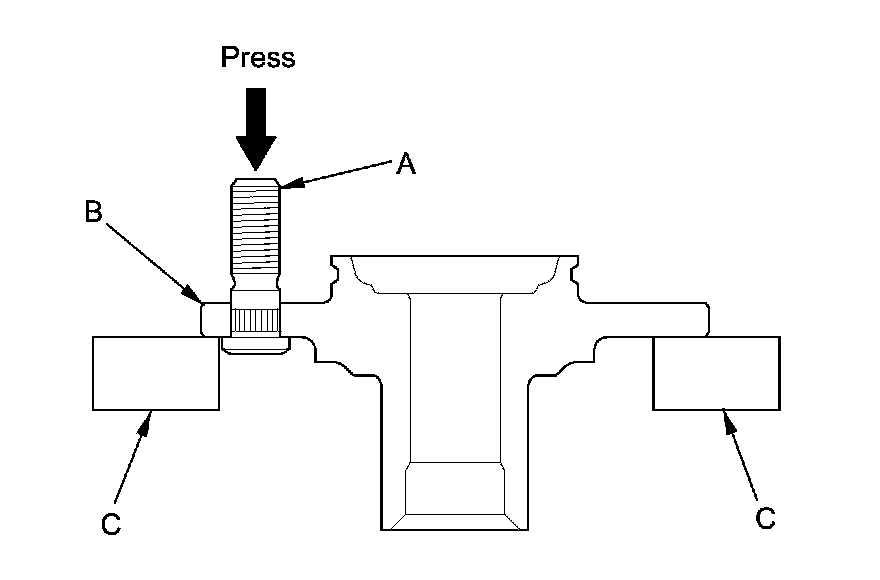 2. Separate the wheel bolt (A) from the hub (B) using a hydraulic press. Support the hub with hydraulic press attachments (C) or equivalent tools.