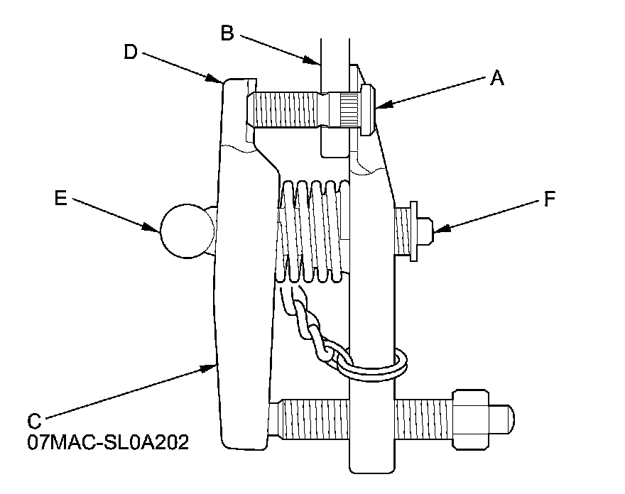 - If the angle of the remover against the wheel bolt is not square, readjust the ball joint remover by turning the head (E) of the adjusting bolt (F).