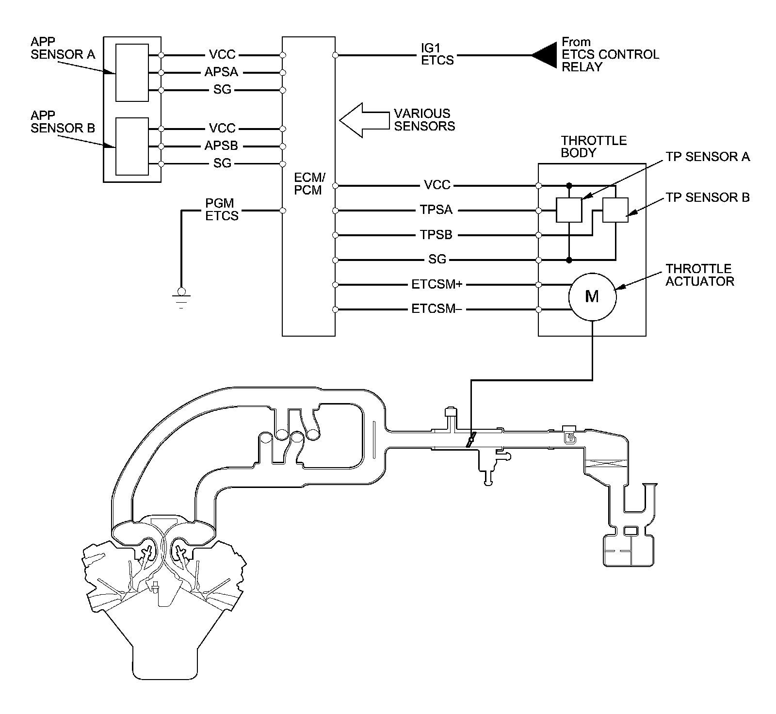 The electronic throttle control system consists of the throttle actuator, throttle position (TP) sensor A/B, accelerator pedal position (APP) sensor A/B, the electronic throttle control system (ETCS) control relay, and the ECM/PCM.