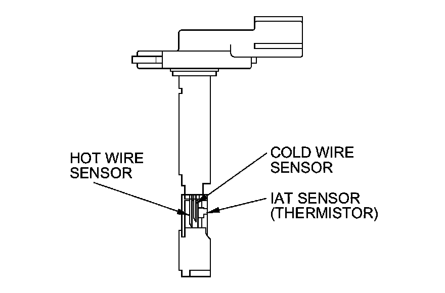 The mass air flow (MAF) sensor/intake air temperature (IAT) sensor contains a hot wire sensor, a cold wire sensor, and a thermistor. It is located in the intake air passage. The resistance of the hot wire sensor, a cold wire sensor, and the thermistor changes due to intake air temperature and air flow. The control circuit in the MAF sensor controls the current to keep the hot wire at a set temperature. The current is converted to voltage in the control circuit, then output to the ECM/PCM.