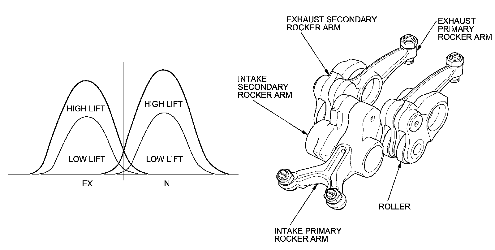 - Both the intake valve side and the exhaust valve side have primary and secondary rocker arms. These rocker arms are locked and separated to change the cam profile by switching the oil passages. Roller rockers are used to minimize mechanical friction.