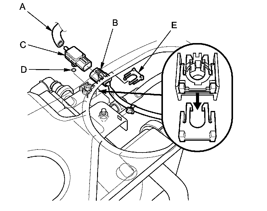 5. Install the parts in the reverse order of removal with a new O-ring (D) and a new retainer (E).
