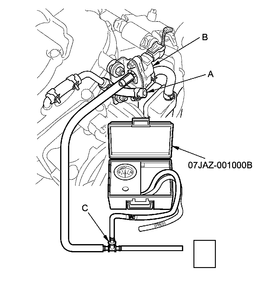 8. Disconnect the vacuum hose (A) from the EVAP canister purge valve (B) in the engine compartment, then connect a T-fitting (C) from the vacuum gauge, and connect the vacuum pump/gauge 0-30 in.Hg, to the EVAP canister purge valve as shown.