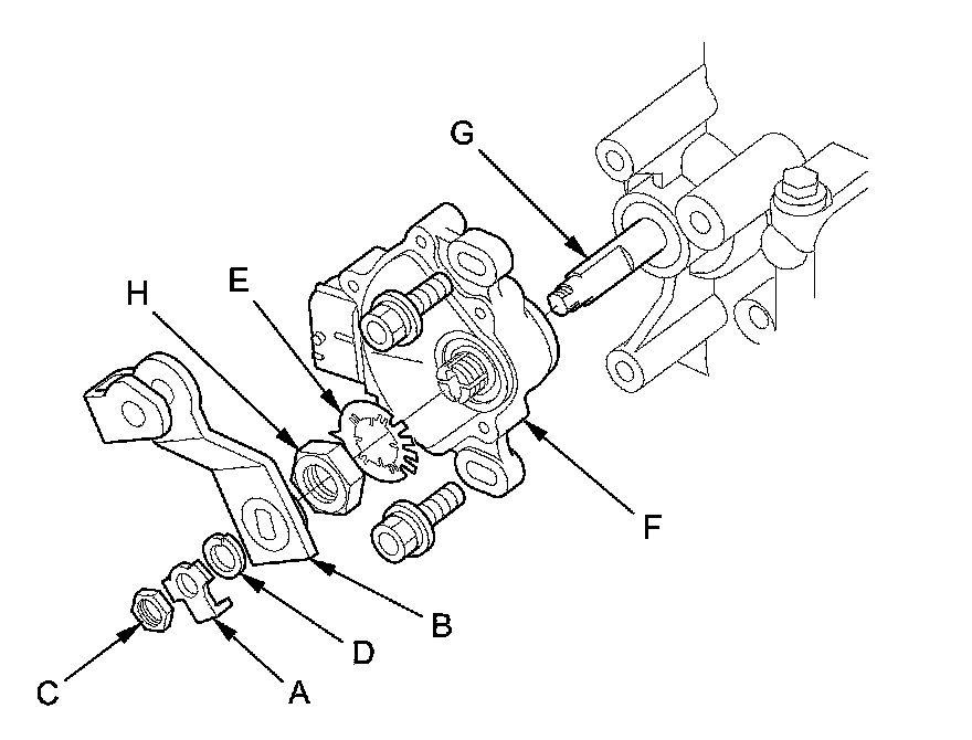9. Pry the lock tabs of the lock washer (E) on the transmission range switch (F), hold the selector control shaft (G) with a 6.0 mm wrench, and loosen the locknut (H).