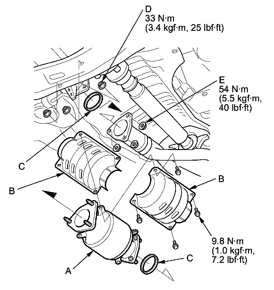 5. Install the parts in the reverse order of removal with new gaskets (C) and new self-locking nuts (D) and (E).