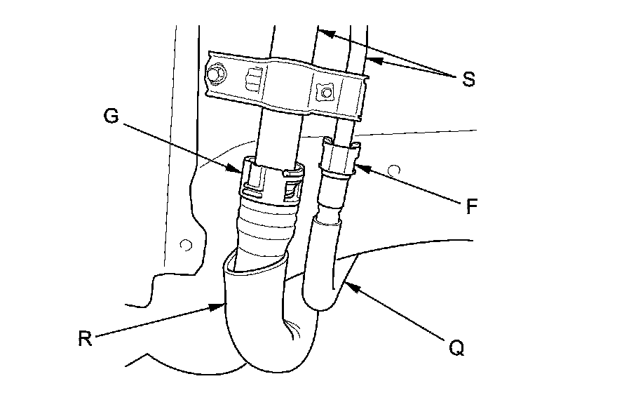 The fuel line/quick-connect fittings (A, B, C, D, E, F, and G) connect the fuel joint hose (H) to the fuel feed hose (I), the fuel feed hose to the fuel line (J), the fuel line (K) to the fuel tank unit (L), the fuel vapor line (M) to the EVAP canister (N), the fuel vent tube (O) to the fuel vent tube B (P) and the fuel tank vapor recirculation tube (Q) and fuel fill neck tube (R) to the fuel fill pipe (S). When removing or installing the fuel feed hose, the fuel tank unit, or the fuel tank, or when disconnecting or connecting the quick-connect fittings, pay attention to the following: