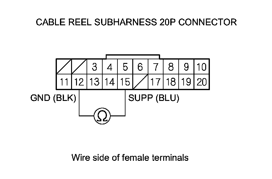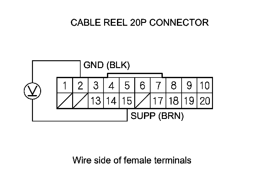 9. Measure the voltage between cable reel 20P connector terminals No. 2 and No. 15.