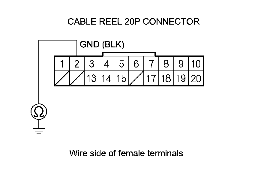 6. Check for continuity between cable reel 20P connector terminal No. 2 and body ground.