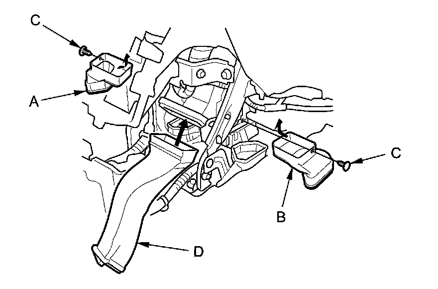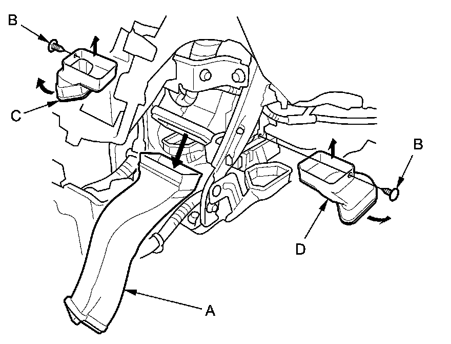 4. Remove the clips (B), then remove the left and right heater ducts (C, D).